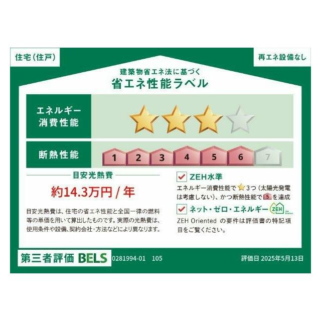 | エネルギー消費性能 | ★★★(削減率20%達成) | 断熱性能 | 6段階/7段階中 |