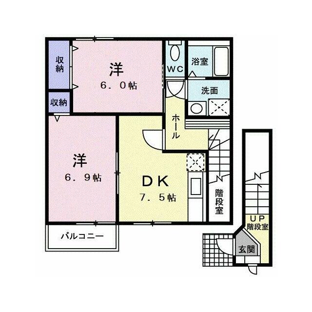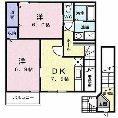 | 間取り | 2DK(洋6、洋6.9、DK7.5) | 主要採光面 | 南 |