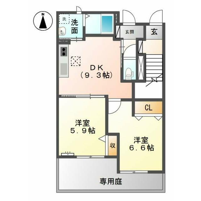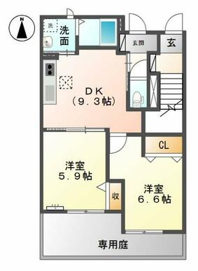 | 間取り | 2DK(洋5.9、洋6.6、DK9.3) | 主要採光面 | 南 |